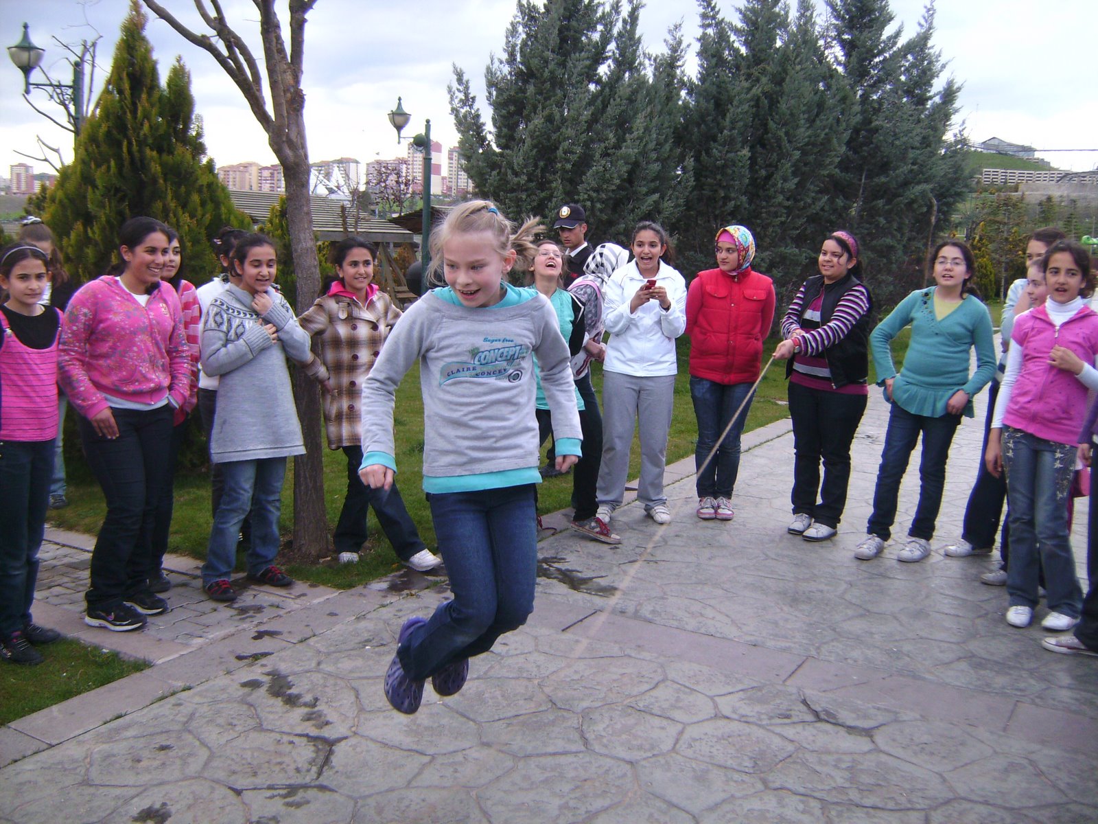 What I wanted was a picture of KH taking their picture and showing them.I said a few things in Turkish to them, then the frenzy broke loose. They all (and there were close to 30 of them) began talking to me. All at once. All in Turkish. All loud. All giggly. It was so much fun! But I was struck at how they were 'feeding' off each other. The more of them who tried to talk to me, the more excited they got, the louder they got, the sillier they got. They were all just precious. Then they invited us to jump rope with them. I grabbed hands with one of them and we jumped in. Roller skating or jump roping? I'm your girl. They begged Annika to jump with them. Pairs, triplets, alone, in a huge group. She did it all. She was the Rock Star of the day, getting up to 70 something jumps. When others would jump in, I kept hearing, "NO! What's the matter with you?! Let the foreigner do it. We want to see the foreigner jump!"