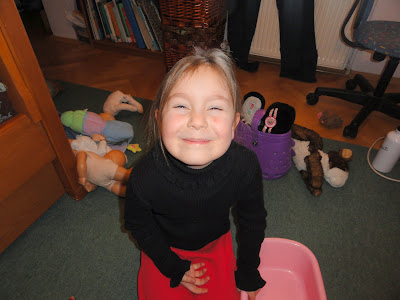 Sweet Cheeks shares a room with her oldest sister. She never junks up the room. Even her clothes are kept in a wardrobe in a different room. What she does instead is store everything in her bed. So, routinely we have to have Operation Bed Clean Out. Knowing she is getting older and more capable now, I told her to go and start the process. I told her to pull everything out that wasn't a pillow or covers and put them in groups according to what they were. When I went up, she had brown stuffed animals, other-colored stuffed animals, dollies, houseshoes, art supplies, books...all in neat categories. She has a twin-sized bed. Can you believe all this was in her bed?!
